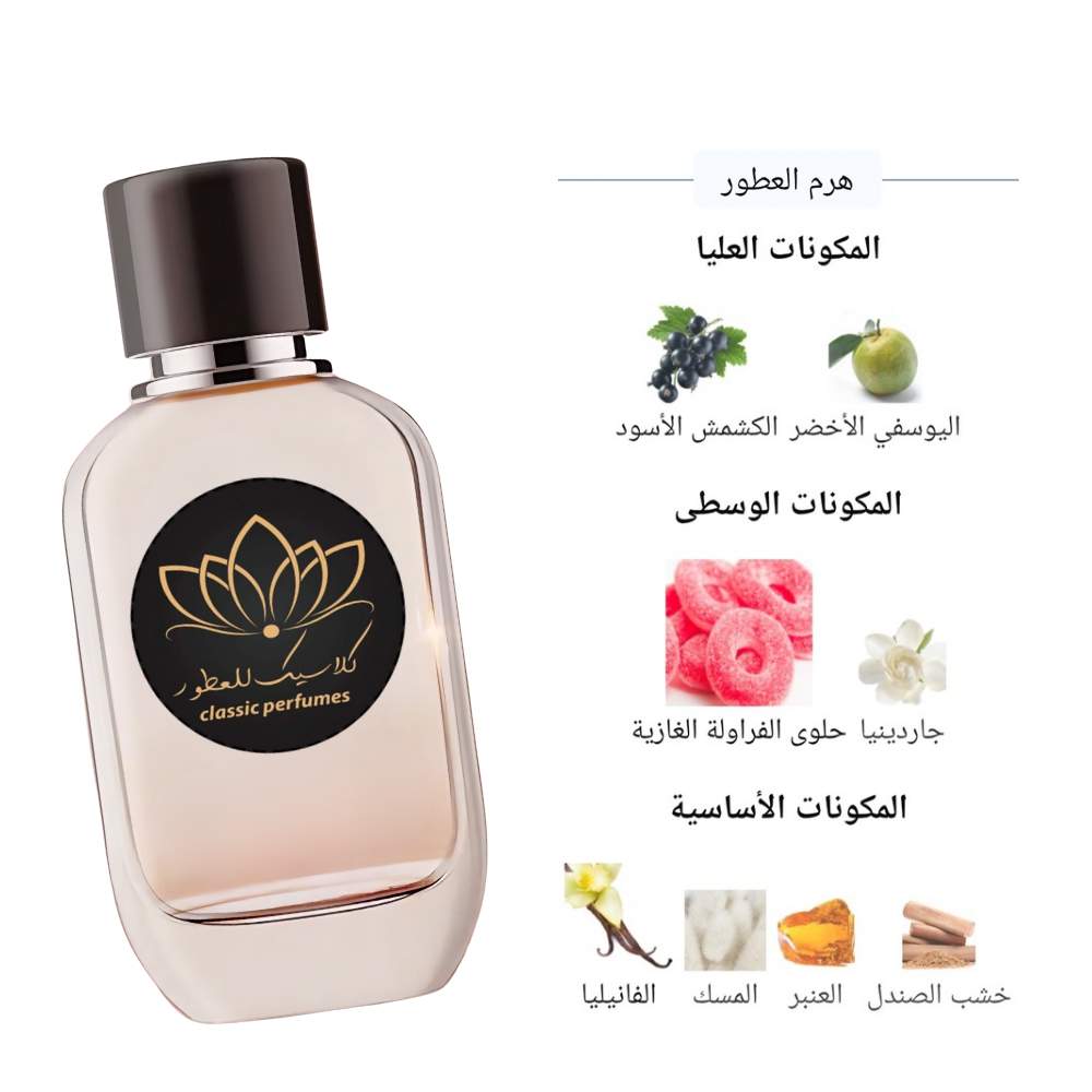 الطابع: عطر غورماند – فاكهي – استوائي (Gourmand Fruity Tropical). يتميز بالثراء، الحلاوة السكرية المكثفة، والأجواء الاستوائية. يجسد البهجة والإثارة والأنوثة الساطعة.