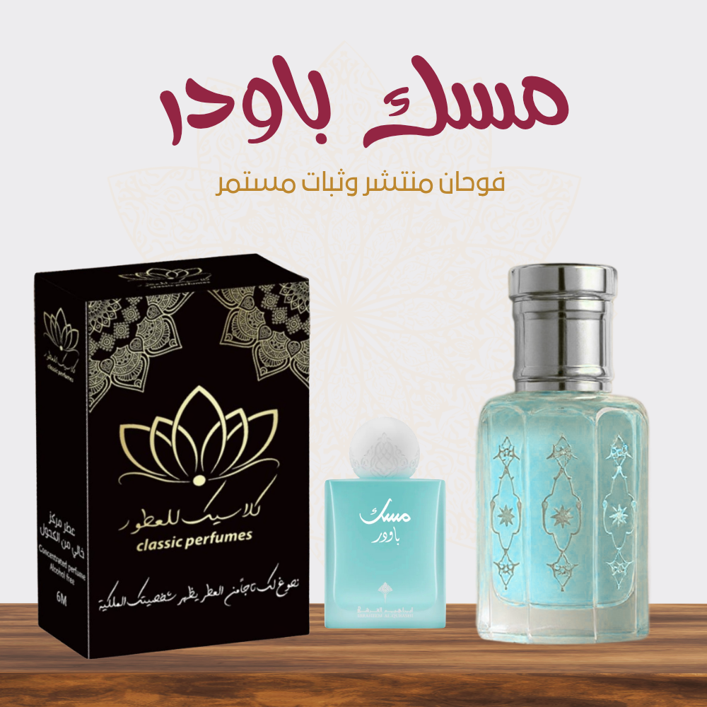 مسك البودر (Powder Musk) هو عطر فاخر يجمع بين رائحة المسك الأبيض الناعمة ورائحة البودرة والزهور (مثل الياسمين والورد)، والفانيليا والعنبر، مما يخلق رائحة دافئة، ناعمة، منعشة، ومريحة للجنسين، ويُستخدم لإضفاء شعور بالنظافة، الانتعاش، والثقة، وله فوائد عاطفية كتهدئة الأعصاب وتحسين المزاج، ويُفضل وضعه بعد الاستحمام لثبات أطول.